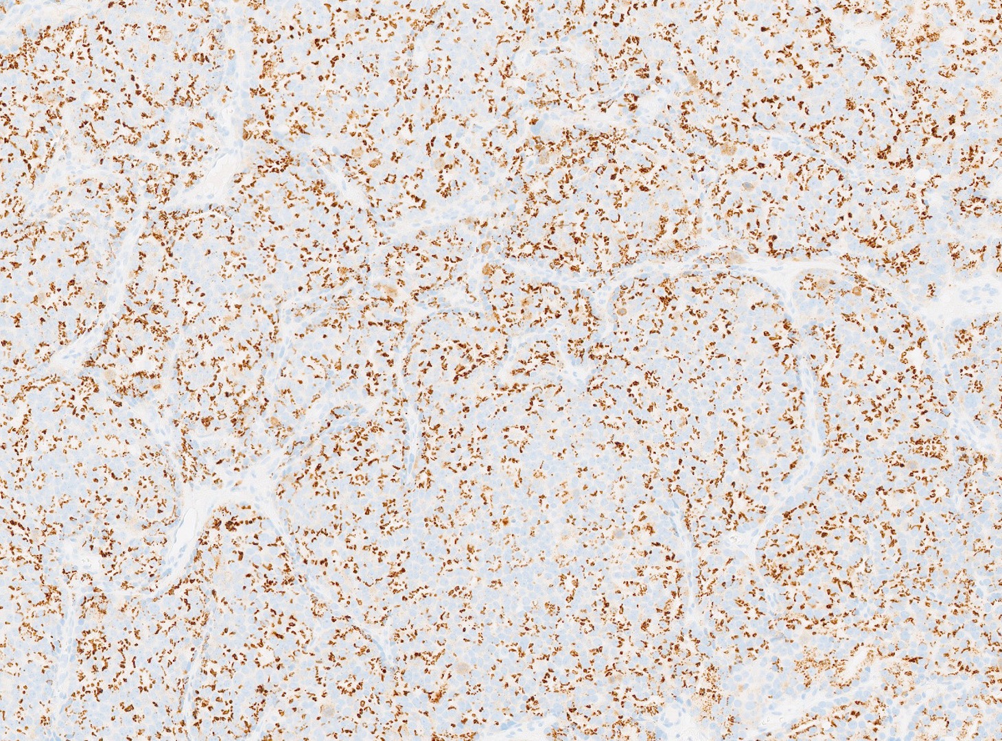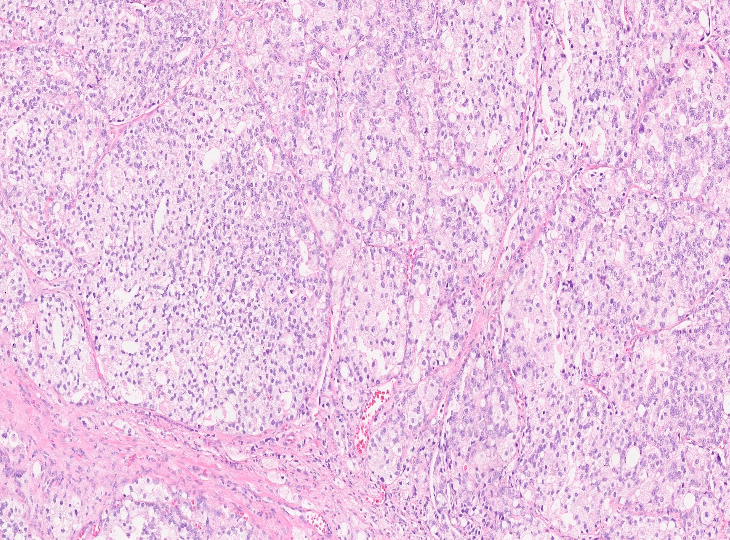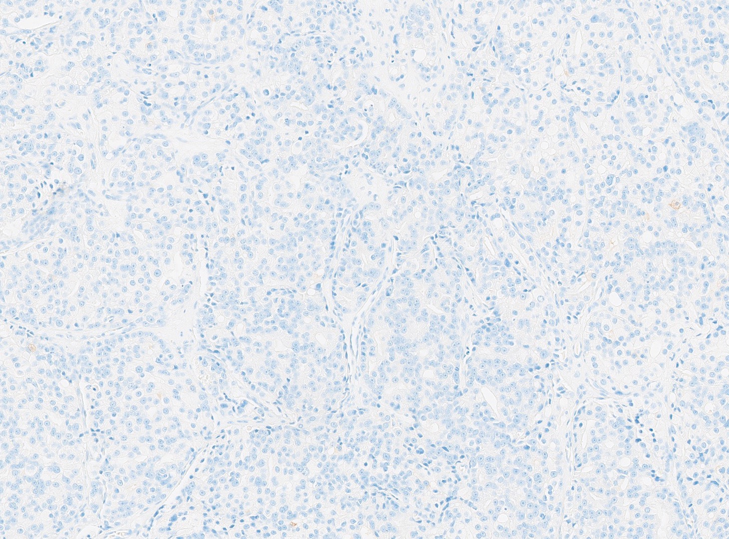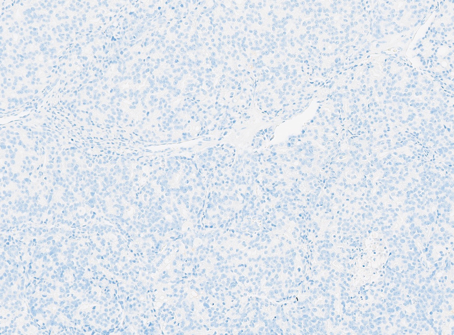 The patient is a 72-year-old male with a history of urinary hesitancy and nocturia, previously attributed to benign prostatic hyperplasia (BPH). He presented to his primary care physician with a 3-month history of unintentional weight loss (~12 lbs), fatigue, and right upper quadrant abdominal discomfort. No history of jaundice, hepatomegaly on exam, or alcohol use disorder. A CT abdomen/pelvis with contrast revealed multiple hypodense lesions in both hepatic lobes, the largest measuring 3.1 cm in segment VI, concerning for metastatic disease. The prostate was enlarged, but no discrete mass was identified on imaging. Bone scan showed sclerotic lesions in the pelvis and lumbar spine, consistent with osseous metastases. A liver biopsy was obtained from the largest lesion in the right hepatic lobe for diagnostic confirmation.
