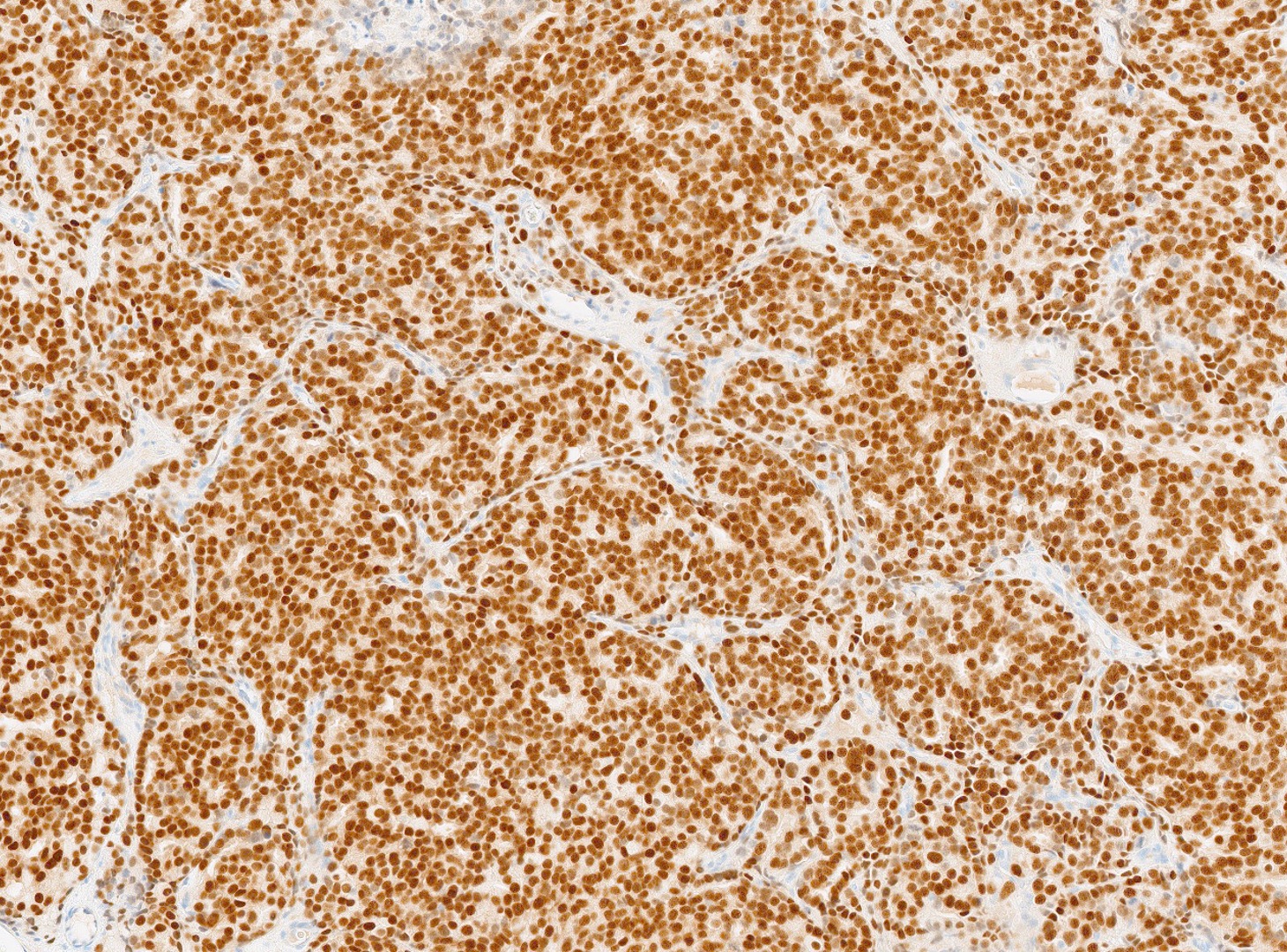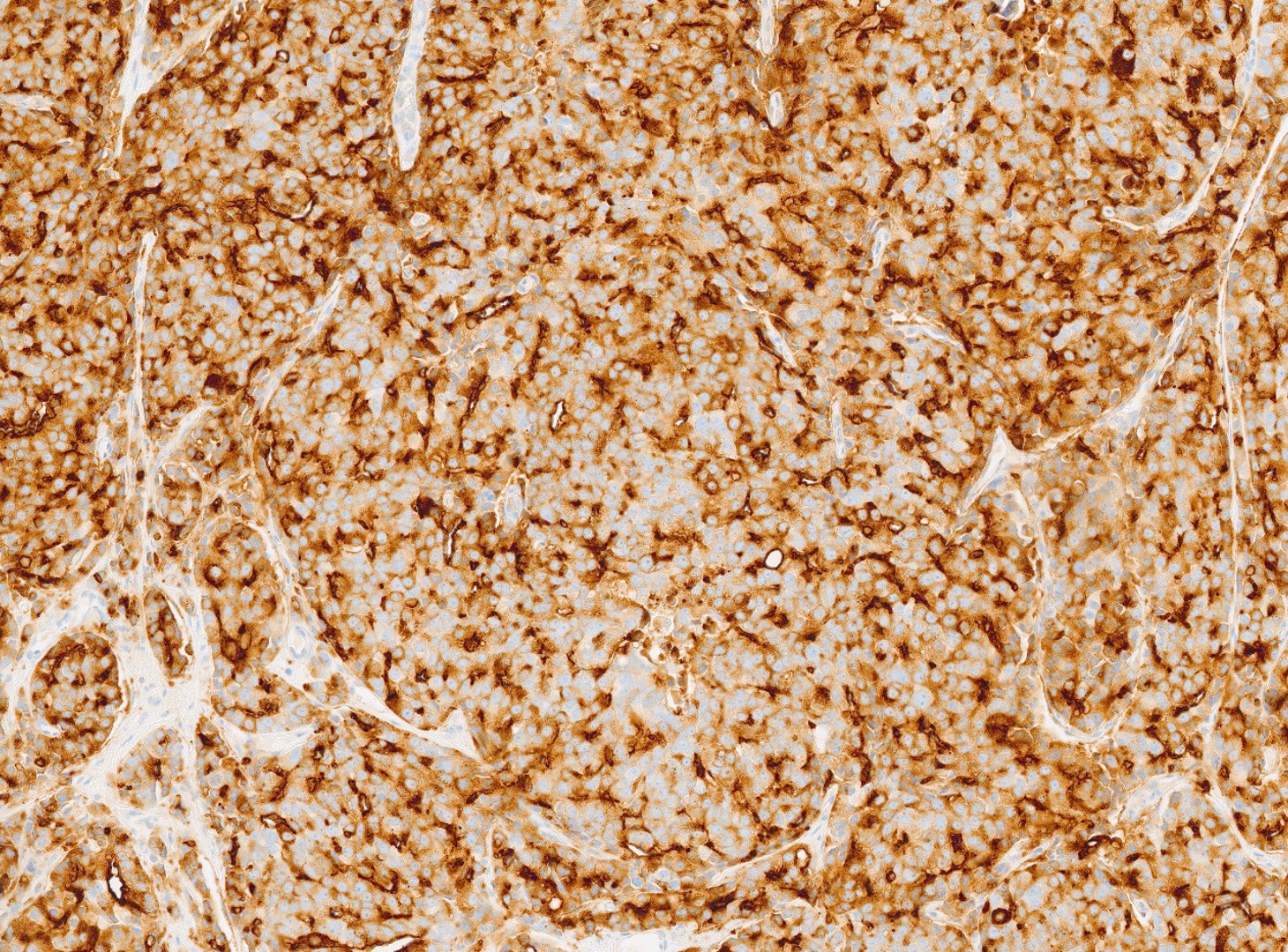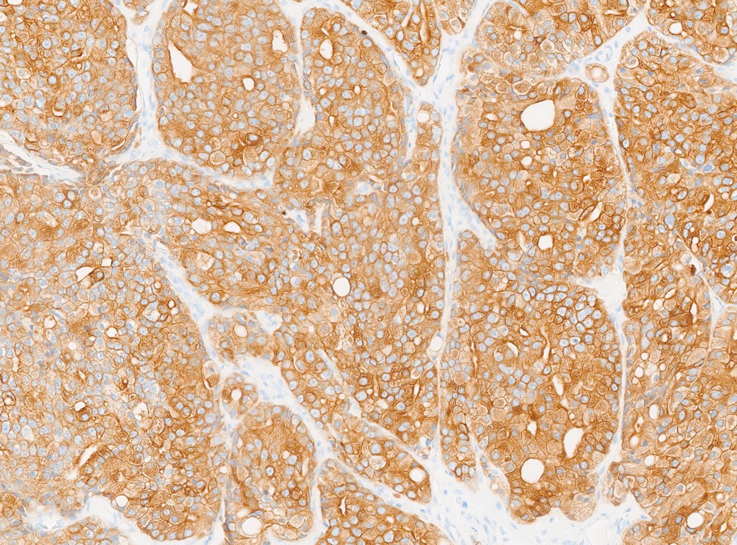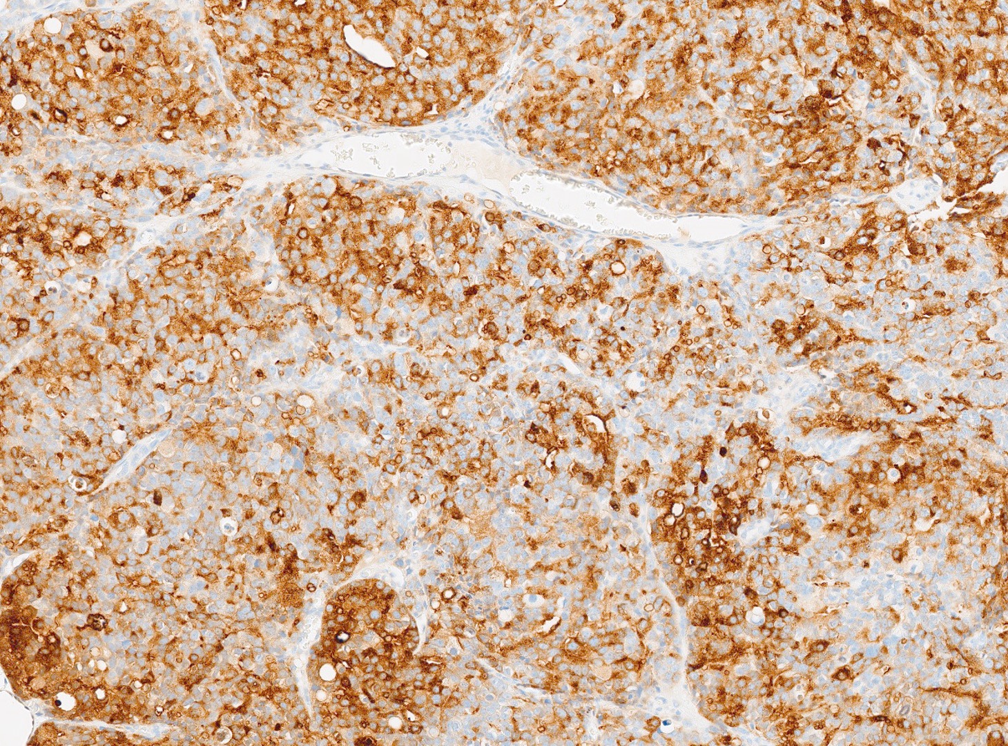 The patient is a 72-year-old male with a history of urinary hesitancy and nocturia, previously attributed to benign prostatic hyperplasia (BPH). He presented to his primary care physician with a 3-month history of unintentional weight loss (~12 lbs), fatigue, and right upper quadrant abdominal discomfort. No history of jaundice, hepatomegaly on exam, or alcohol use disorder. A CT abdomen/pelvis with contrast revealed multiple hypodense lesions in both hepatic lobes, the largest measuring 3.1 cm in segment VI, concerning for metastatic disease. The prostate was enlarged, but no discrete mass was identified on imaging. Bone scan showed sclerotic lesions in the pelvis and lumbar spine, consistent with osseous metastases. A liver biopsy was obtained from the largest lesion in the right hepatic lobe for diagnostic confirmation.